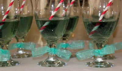 We mixed ginger ale with white cranberry juice and added a few drops of blue food coloring to get these fun mocktails this pretty aqua color. Just a tip- don't add any fresh fruit. We put blueberries in the mix and it turned the drink purple! It also clogged up the spout of the dispinser. Lesson learned!